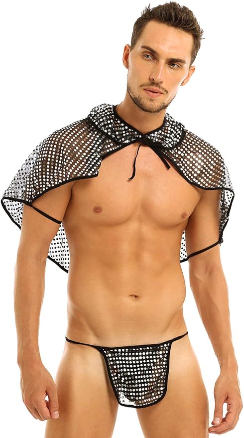 Agoky Mens See Through Roman Gladiator Costume Fancy Dress Role Play Outfits Cape Shawl Collar with G-String Set