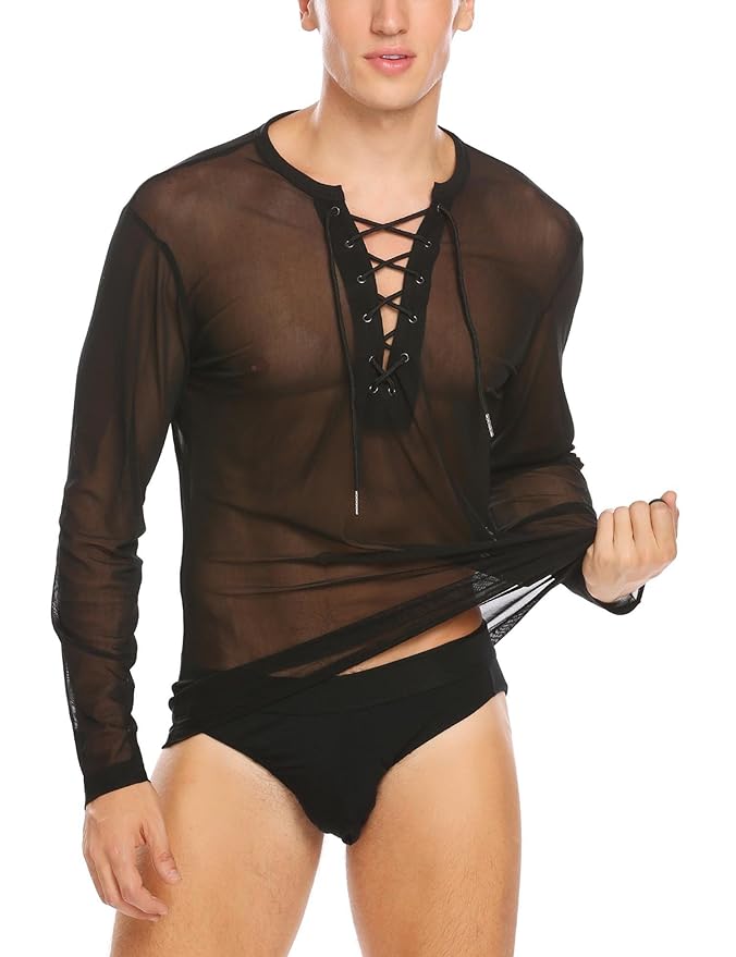 JINIDU Men's Stylish Sexy See Through Long Sleeve Lace up Shirt