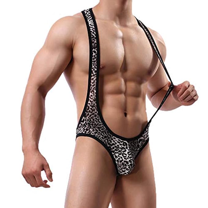 baskuwish Men's Sexy Jockstrap Leotard Underwear Jumpsuits Wrestling Singlet Bodysuit,Leopard Print Buttock